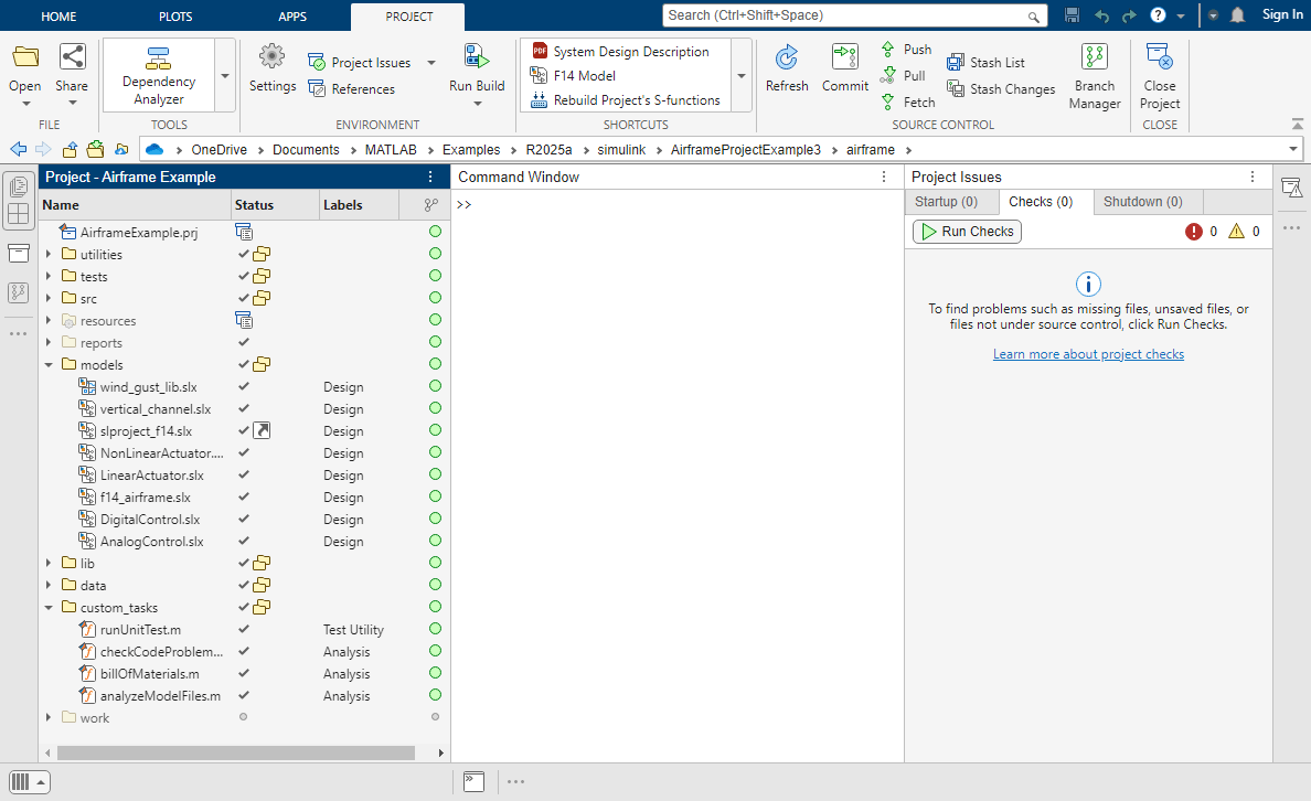 The MATLAB desktop shows the Project panel with the project open on the left, the Project toolstrip on top, the Command Window in the middle, and the Project Issues panel on the right.