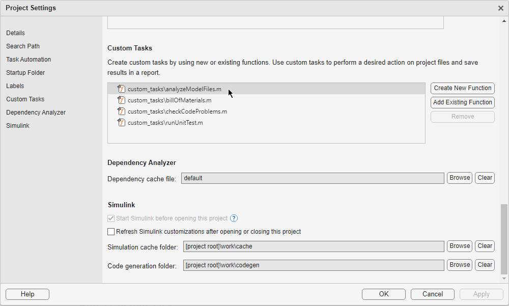 The Custom Tasks dialog box prepopulates the Custom Task field with analyzeModelFiles.