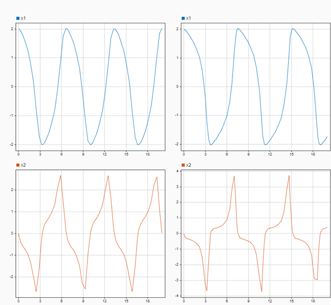 Create the data in the Simulation Data Inspector by simulating the model vdp twice. The first time, specify the value of Mu as 1. For the second simulation, set the value of Mu to 2. The model logs data for the signals x1 and x2.