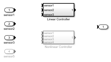 Add an input port sensor4 to the variant choice Nonlinear Controller and simulate the model. The simulation fails because there is no input to sensor4 due to the absence of the corresponding input port in the Controller block.