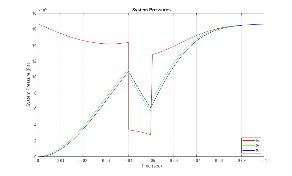 As the valve opens, pressures p2 and p3 build up while p1 decreases in response to the load increase. When the pump flow cuts off, the spring and piston act like an accumulator, and p3 decreases continuously. Then, the flow reverses direction, so p2, though relatively close to p3, falls. At the pump itself, all of the back-flow leaks, and p1 drops. The behavior reverses as the flow is restored.