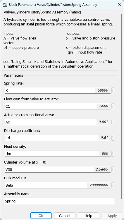 To view the Actuator subsystem, right-click the masked Valve/Cylinder/Piston/Spring Assembly subsystem and select Mask > Look Under Mask. A system of differential-algebraic equations models the cylinder pressurization with the pressure p3, which appears as a derivative in Equation Set 3 and is used as the state (integrator). If the piston mass is neglected, the spring force and piston position are direct multiples of p3, and the velocity is a direct multiple of the time derivative of p3. The latter relationship forms an algebraic loop around the Beta Gain block. The intermediate pressure p2 is the sum of p3 and the pressure drop due to the flow from the valve to the cylinder (Equation Set 4). This relationship also imposes an algebraic constraint through the control valve and the 1/C1 gain.