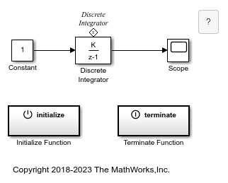 The Terminate Function block is a preconfigured Subsystem block that executes on a model terminate event. By default, the Terminate Function block includes: