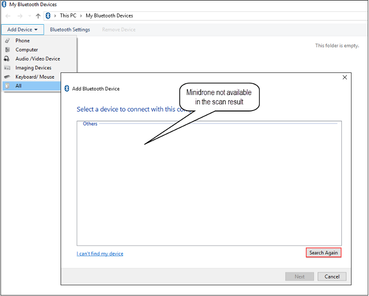 If the minidrone does not appear in the list, it indicates that the Bluetooth driver installation was not successful. In that case, install the driver again using the steps listed in Bluetooth Connection Fails.