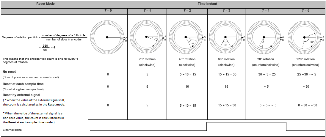 You can reset the encoder readings from the block using the Reset mode parameter in the block parameters dialog box.