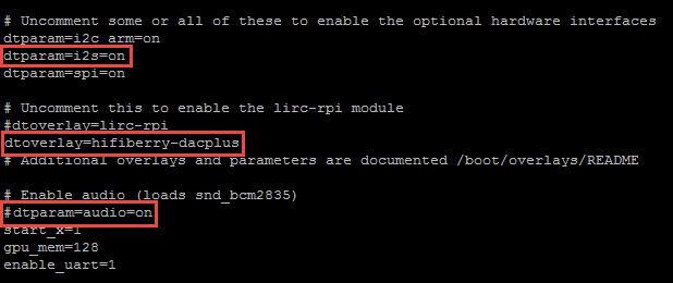 dtparam=i2s=onin the hardware interface section of the file.To configure the HiFiBerry DAC, add