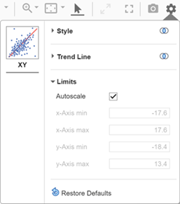 . To change the limits, first, clear Autoscale. Then, enter new values for the x and y limits. These limits apply to the currently selected XY subplot. By default, Autoscale is selected, which performs a fit-to-view on the XY subplot.