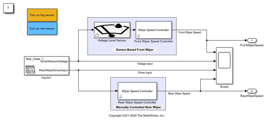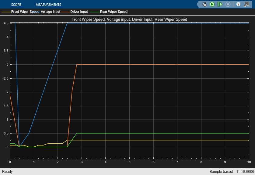 Simulate the model and observe the speed of the front and rear wipers as the sensor voltage and driver input change.