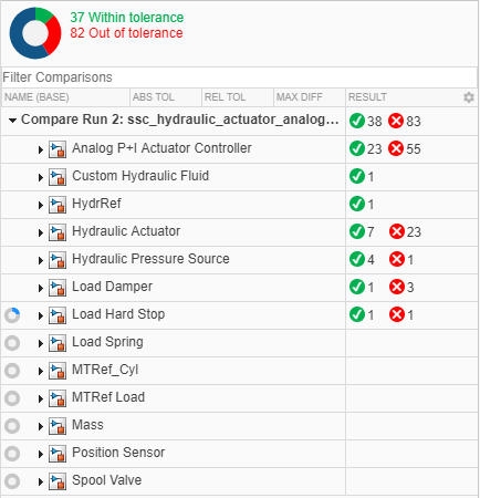 The runs and signals used in this example are relatively small, and comparisons run quickly. When you compare long signals or runs containing many signals, comparisons may take more time. The Simulation Data Inspector displays incremental progress indicators during comparison, and the Compare button becomes a Cancel button you can click to cancel the comparison at any point. For hierarchical data, the Results column in the comparison view summarizes the results on each hierarchical node.