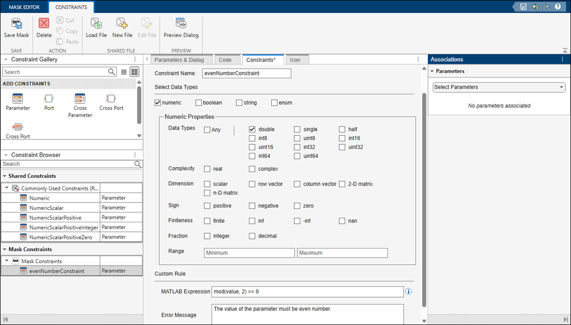 Constraints help you to create validations on a mask parameter without having to write your own validation code. Constraints ensure that input value for the mask parameter satisfies the rules associated with the constraints. For example, on a masked Subsystem block, you can set a constraint where the input value must be an even number. If you provide an input that is not an even number, the software displays an error.