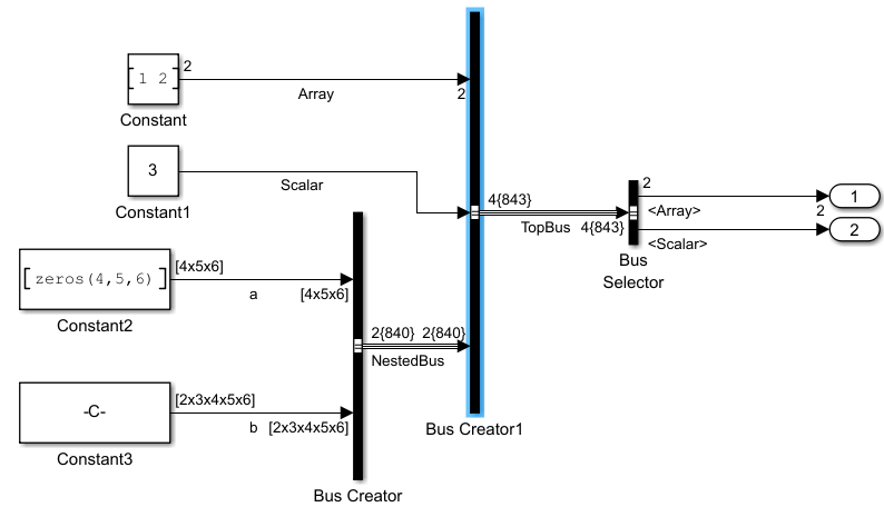 In ex_BusPortDim model, Bus Creator1 block receives a non-virtual bus (NestedBus) at one of its input ports and outputs a virtual bus (TopBus).