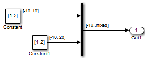 ![In this model, output dimension of a Mux block is displayed as [min..max], where min indicates the minimum design dimension of the input signals and max indicates the maximum design dimension of the Mux output.](display_design_range.png)