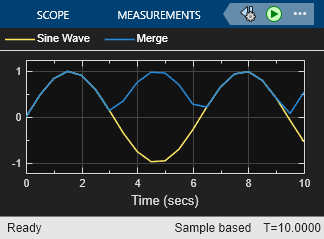 The Merge block passes the output of the currently enabled subsystem along with the original waveform to the Scope block.