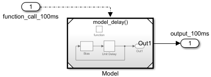 Specified discrete time | The function-call initiator (Inport block), in test model, connected to the function-call input port (Trigger block) must have a sample time equal to the specified discrete time for the Inport block. For simulation, component executes at the specified discrete rate. If a function-call source uses a different sample, Simulink displays an error message. | ||