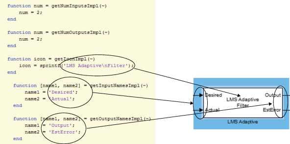 The source code for this System object also defines two input and output ports for the block.