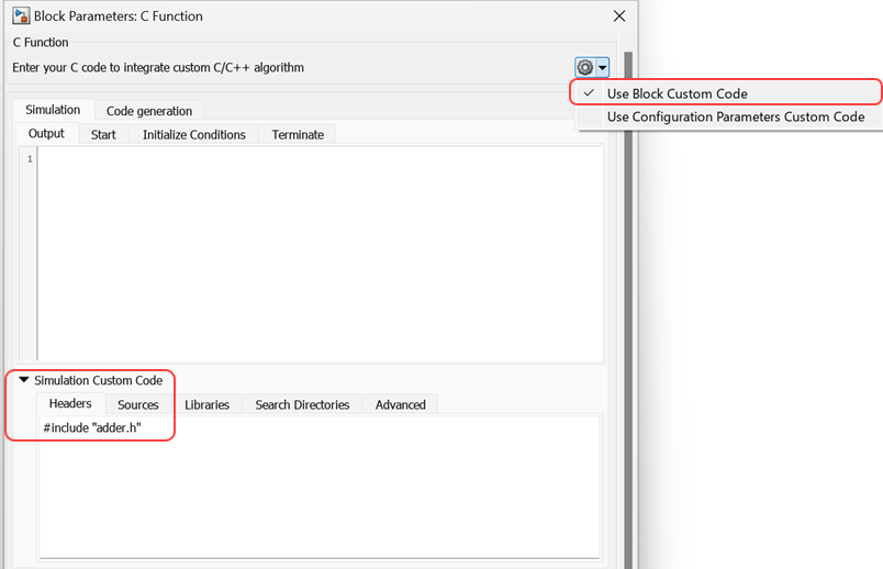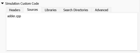 pane, define the header file by entering #include "adder.h". For more information, see Specify and Configure Custom C/C++ Code.Define source file — In the block dialog box, under the Simulation tab, expand the Simulation Custom Code section and define the source file in the Sources field by entering