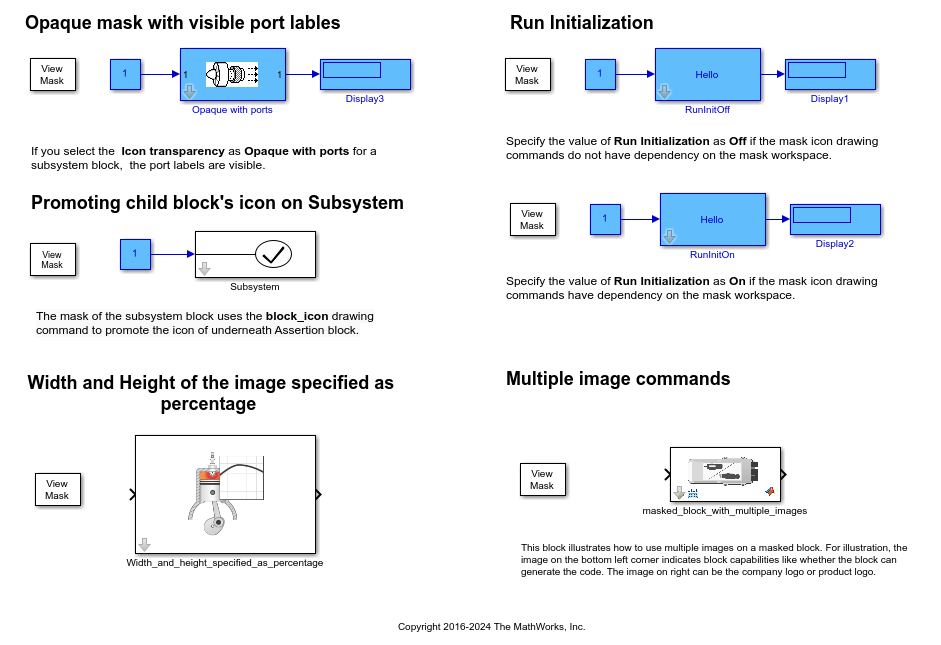 This example model contains Subsystem blocks that demonstrates the mask icon drawing commands.