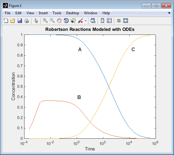 title('Robertson Reactions Modeled with ODEs')
