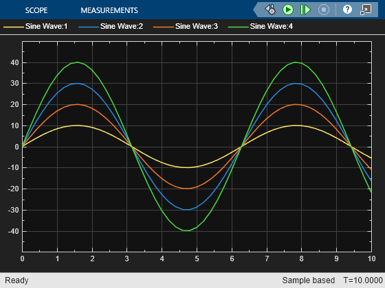 In this simple model, a Sine Wave block is connected to a scope block. The Sine Wave block outputs four signals with the amplitudes [10, 20; 30 40]. The Scope block displays each sine wave in the array separately in the matrix order (1,1), (2,1), (1,2), (2,2).