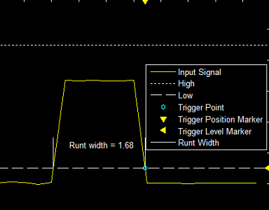 Runt— Trigger when a signal crosses a low threshold or a high threshold twice within a specified time.