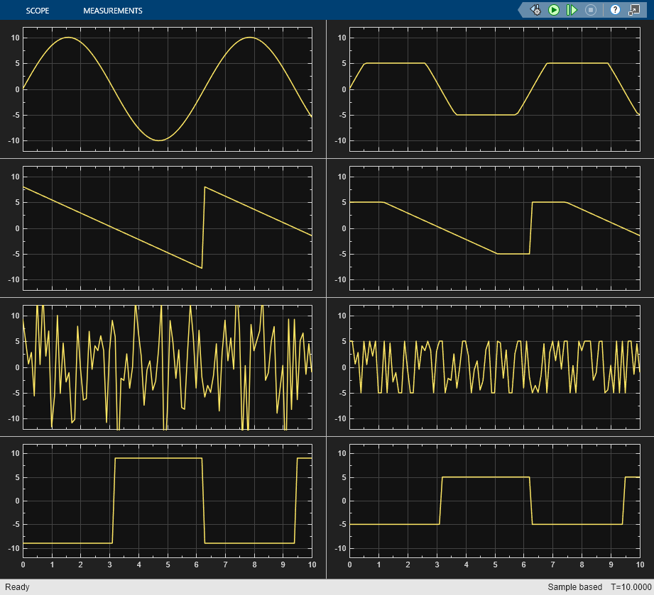 This example shows how to use a C Function block within a For Each subsystem. The example passes a vector signal into the For Each subsystem, which repeats execution of the C Function block on each element of the input signal and concatenates the results. The C Function block calls the custom code function customSaturateFcn(), which implements a saturation algorithm and outputs a clipped version of the input signal. A C Caller block with the same settings can also be used in place of a C Function block in a For Each subsystem.