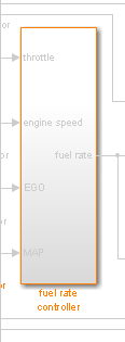 Objects that contain child objects with associated outgoing links are highlighted with an orange outline, such as the fuel rate controller subsystem.