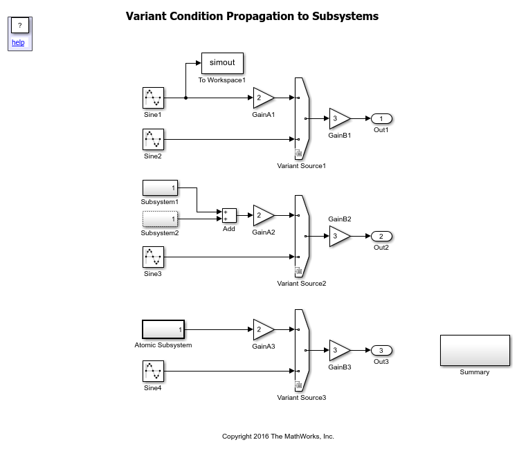This example shows the propagation of variant conditions from a Variant Source block to Subsystem blocks. Simulink® propagates variant conditions to these types of subsystems different.