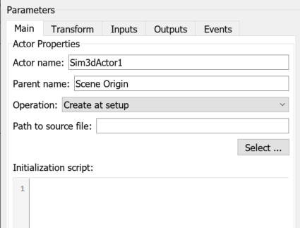 The Simulation 3D Actor block adds an actor to the 3D environment. Double-click the Simulation 3D Actor block to open the Block Parameters dialog box. To create an actor before simulation starts, on the Main tab, set the Operation parameter to Create at setup. The block first creates an empty actor with the name specified in the Actor name parameter. You can use any name for the actor. Then, the block loads the source file, if any is present, and runs the Initialization script to build an appearance for the actor. For more details, see Operating Modes. For this example, the block does not build an appearance for the actor in the 3D environment.