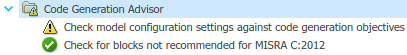 The Code Generation Advisor checks whether the model includes blocks or configuration settings that are not recommended for MISRA C:2012 compliance and Polyspace code analysis. For this model, the check for incompatible blocks passes, but some configuration settings are incompatible with MISRA compliance and Polyspace checking.