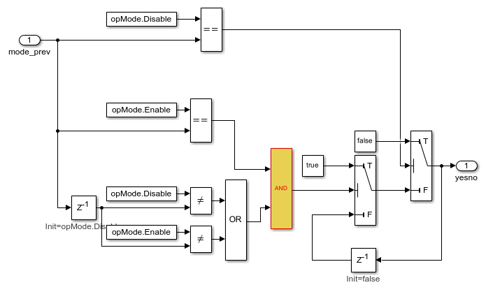 Note: The Assertion block is set to Stop simulation when assertion fails when the actual operation mode is not the same as the expected operation mode.