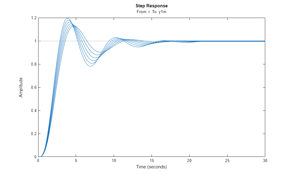 To study the effects of the varying gain values, analyze the linearized models in G. For example, examine the step responses for all Kp2 values and the third Ki1 value.