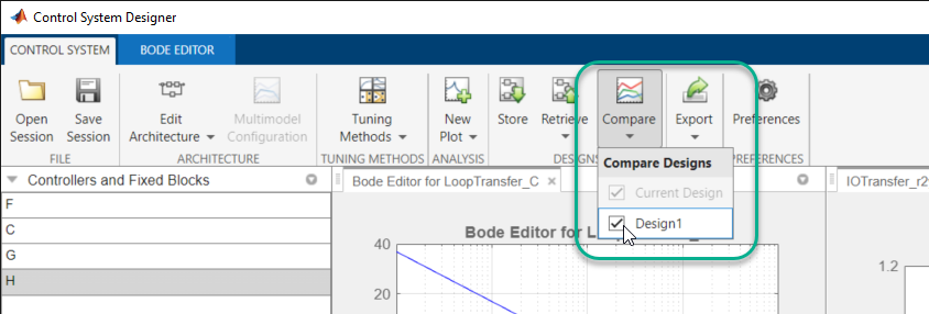 Under some conditions, it is useful to restore a previously stored design. For example, when designing a compensator for a Simulink® model, you can write the current compensator values to the model (see Update Simulink Model and Validate Design). To test a stored compensator in your model, first restore the stored design as the current design.