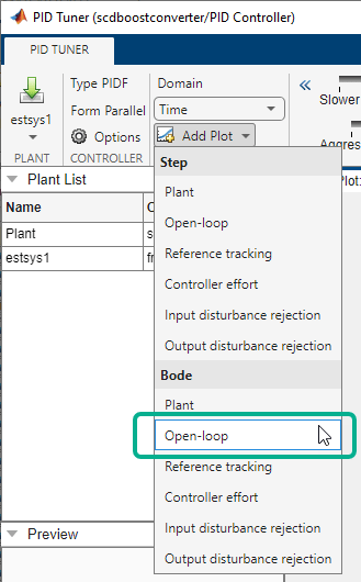 Since you are using an estimated frequency response, PID Tuner cannot plot a step response. To view the frequency response, click Add Plot, and under Bode, click Open-loop.