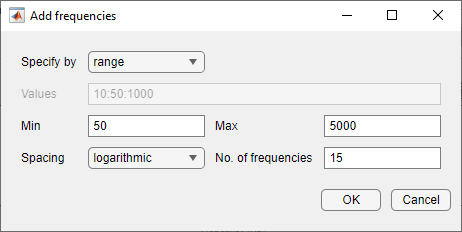 In the Add frequencies dialog box, specify 15 logarithmically-spaced frequencies ranging from 50 Hz to 5 kHz.