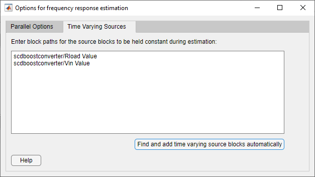 The model has time-varying line and load disturbances modeled as step functions that will interfere with the frequency response estimation. To hold these disturbances constant during the simulation, click More Options. Then, in the Options for frequency response estimation dialog box, on the Time Varying Sources tab, click Find and add time varying source blocks automatically.