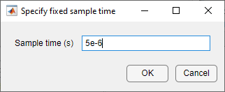 In the Specify fixed sample time dialog box, specify a Sample time of 5e-6 seconds. The sample time of the Sinestream input signal must match the sample time at the input linear analysis point.