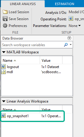 The software simulates the model and creates an operating point that contains the input and state values of the model at the specified snapshot time. This operating point, op_snapshot1, is added to the Linear Analysis Workspace.