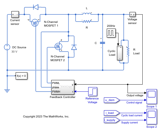 Buck converters convert DC to DC. The model in this example uses a switching power supply to convert a 30V DC supply into a regulated DC supply. The converter is modeled using MOSFETs rather than ideal switches to ensure that device on-resistances are correctly represented. The converter response from reference voltage to measured voltage includes the MOSFET switches. Traditional PID design requires a linear model of the system from the "reference voltage" (controller output) to measured voltage. However, because of the switches in this model, automated linearization results in a zero system. When a model linearizes to zero, several alternatives are available.