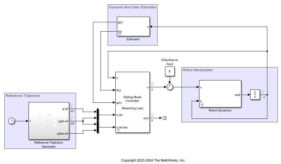 This example shows how to design a controller for a robotic manipulator with two actuated joints using sliding mode control (SMC). SMC is useful for systems that require robustness against disturbances and model uncertainties. Using SMC, you can obtain high-precision tracking of desired trajectories even in the presence of external disturbances and parameter variations. For more information on SMC, see Sliding Mode Control.