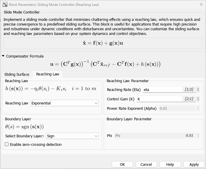 Choose the variant of the reaching law and boundary layer. In this case, use the Exponential reaching law and the sign function for boundary layer.