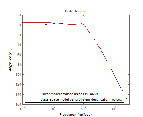 Use System Identification Toolbox™ software to estimate a fifth-order, state-space model. Compare the results of analytical linearization and the state-space model: