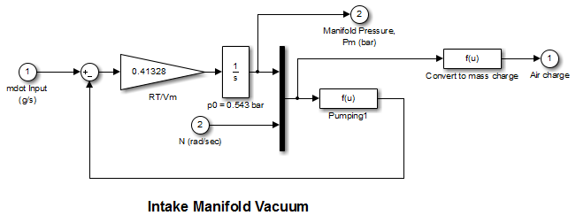 The Convert to mass charge block approximates the relationship between Air Charge, Manifold Pressure, and Engine Speed as a quadratic polynomial.
