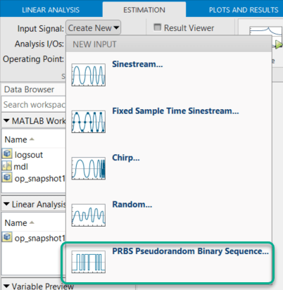 To create a PRBS input signal, in the Model Linearizer, on the Estimation tab, under Input Signal, select PRBS Pseudorandom Binary Sequence.