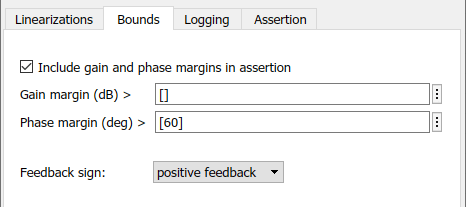 The Check Gain and Phase Margins block is configured to perform an assertion. The assertion fails when the phase margin of the linearized system is greater than 60 degrees. You can view the phase margin bound settings on the Bounds tab.