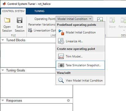 When you are ready to analyze responses or tune your model, select the operating point at which you want to linearize the model. In the Control System tab, in the Operating Point menu, stored operating points are available.