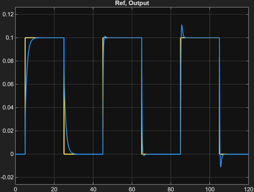 Both speed and yaw-rate reference signals are plotted in the following screenshot. While the vehicle's speed settles at a certain level, its yaw-rate is expected to follow the same square-wave signal regardless of the speed.