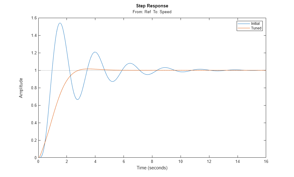 T0 = getIOTransfer(ST0,'Ref','Speed'); T1 = getIOTransfer(ST1,'Ref','Speed'); step(T0,T1) legend('Initial','Tuned')