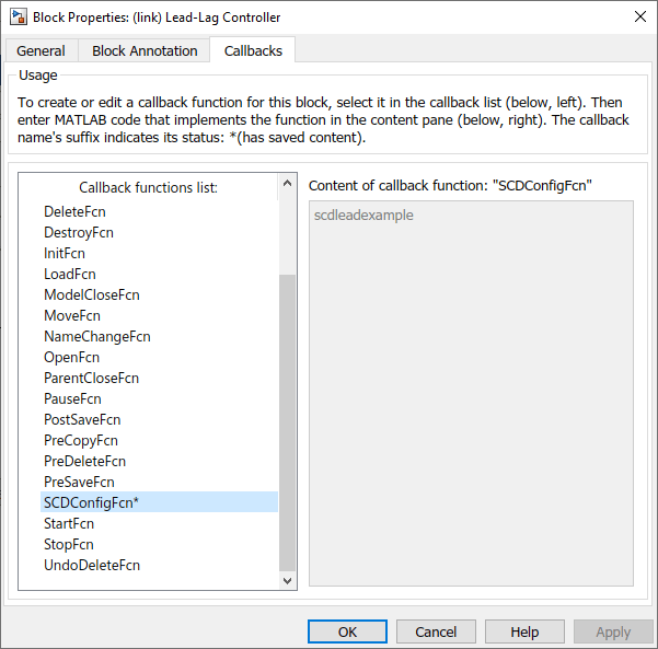 To use a configuration function, specify it as the SCDConfigfcn callback function for the block. To do so, right-click the Lead-Lag Controller block and select Properties. Then, in the Block Properties dialog box, on the Callbacks tab, set SCDConfigFcn to scdleadexample.