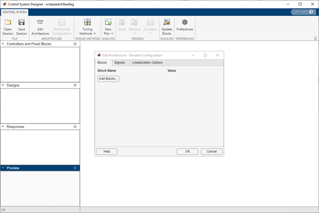 In the Edit Architecture dialog box, on the Blocks tab, click Add Blocks. Then, in the Select Blocks to Tune dialog box, click Feedback Controller, and select Lead-Lag Controller.