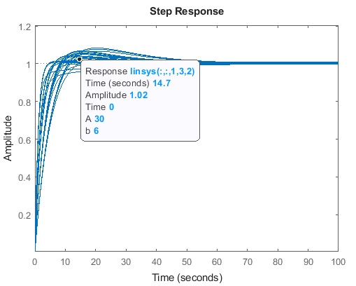 A data tip appears on the plot, providing information about the selected response and the related model. The last lines of the data tip show the parameter combination and simulation snapshot time that yielded this response. For example, in this previous plot, the selected response corresponds to the model obtained by setting A to 30 and b to 4. The software linearized the model after simulating the model for three time units.